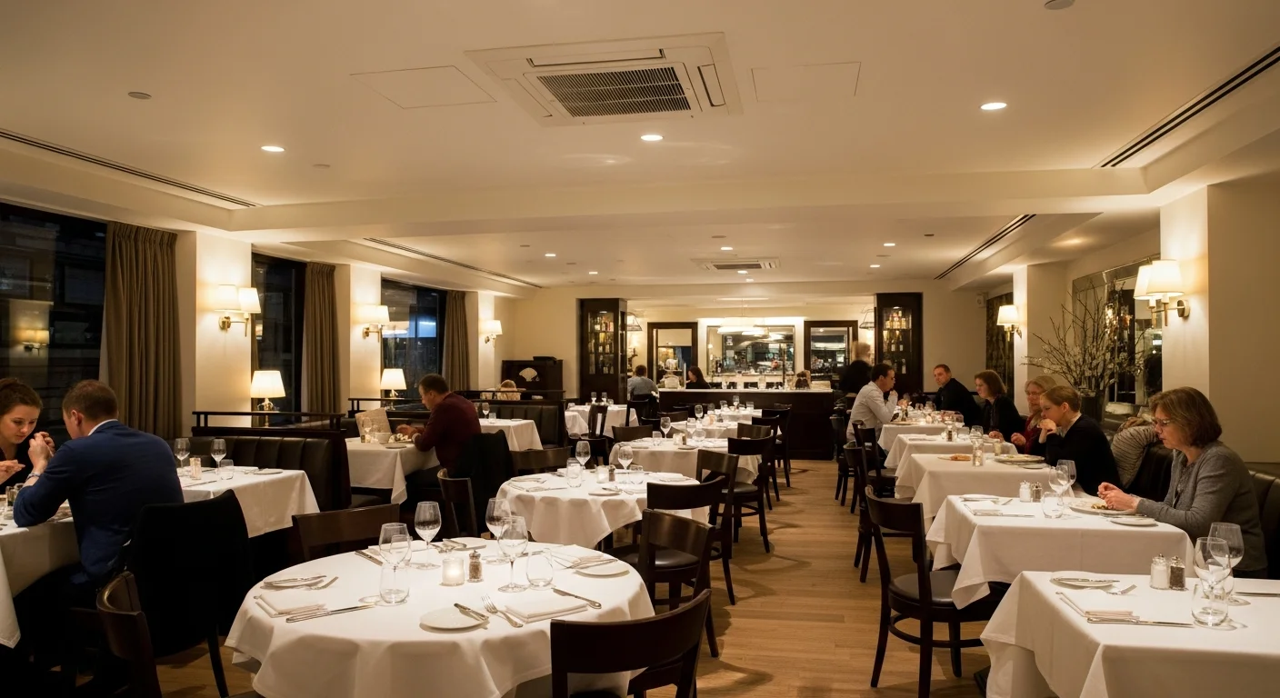 Три кассетных кондиционера Mitsubishi Electric 5 кВт для равномерного охлаждения без сквозняков. Зонирование: гостевой зал, зона бара, летняя терраса. Уровень шума 28 дБ — гости не слышат кондиционер.
